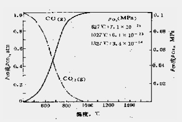 即 碳的直接氧化,即石墨在高溫下由于與空氣(O2)、水蒸汽(H2O)和碳酸氣等共存而被氧化。石墨在560℃以上就開(kāi)始顯著氧化而使含碳制品脫碳損耗,由 圖可以看出右邊部分已被氧化成為脫碳區(qū),在脫碳區(qū)中由于碳的氧化而形成了許多擴(kuò)散通道,氧氣和熔渣通過(guò)擴(kuò)散通道進(jìn)入磚內(nèi),在界面處和碳反應(yīng),反應(yīng)產(chǎn)物通過(guò) 擴(kuò)散通道擴(kuò)散出去。由下圖可以看出在1000℃時(shí),系統(tǒng)中主要以CO氣體形式存在,Pco≈0.1Mpa,生成的CO氣體向外擴(kuò)散,阻止了O2及其它氣體 的進(jìn)入,從而起到氣態(tài)“抗氧化劑”效果,所以碳是能夠穩(wěn)定存在的,但出鋼后冷卻過(guò)程中有可能被空氣氧化。同時(shí)含碳制品襯磚表面上附有渣層,可防止由空氣引 起碳的氧化,起到保護(hù)膜的作用,這種保護(hù)作用在1000℃以上特別明顯。