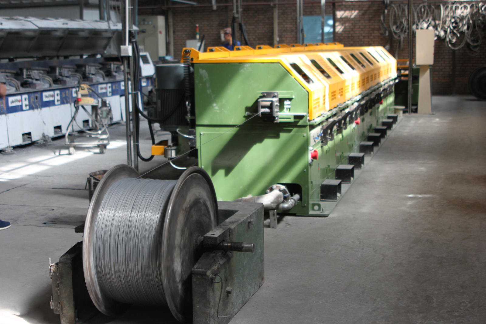 圖為該公司8350拔絲機(jī)正在生產(chǎn)圓珠筆頭用不銹鋼材料。