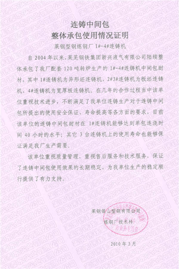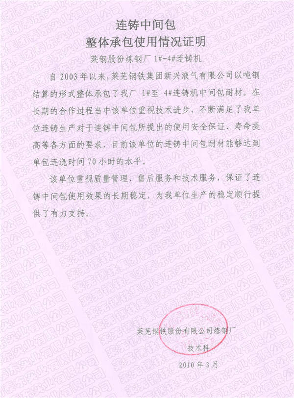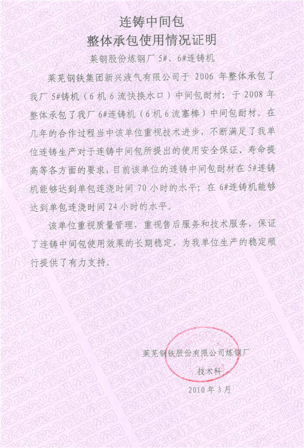 公司以雄厚的技術(shù)力量承擔(dān)著萊鋼全部12臺連鑄機(jī)中間包耐火材料的整體承包服務(wù),經(jīng)過多年的發(fā)展,公司已經(jīng)形成了對連鑄中間包耐火材料方案設(shè)計、生產(chǎn)、研發(fā)、現(xiàn)場施工及售后服務(wù)為一體的綜合體系。目前,在萊鋼中間包連拉爐數(shù)更是突破100小時,達(dá)到國內(nèi)領(lǐng)先水平。